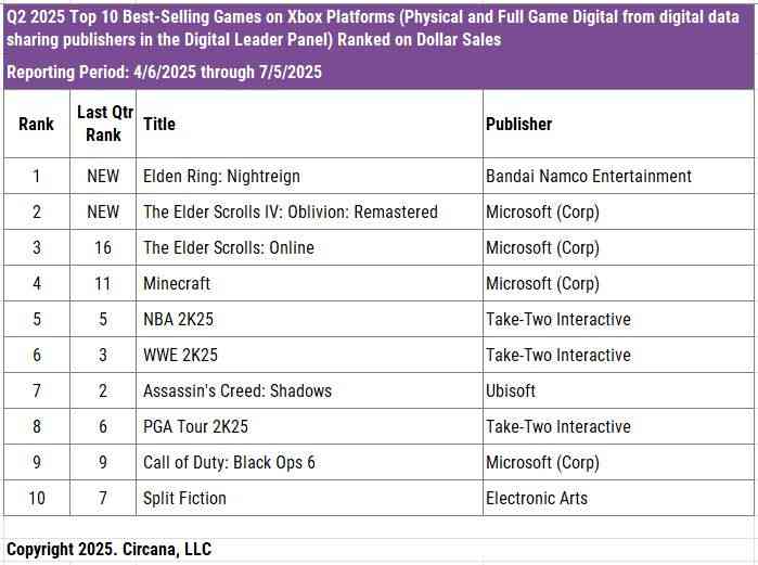 Sementara itu, Indiana Jones and the Great Circle dan Doom: The Dark Ages justru tidak muncul dalam 10 game terlaris di platform Xbox meski tergolong baru. Hanya ada empat game Microsoft yang masuk, yakni The Elder Scrolls IV Oblivion Remastered di posisi kedua, The Elder Scrolls Online di posisi ketiga, Minecraft di posisi keempat, dan Call of Duty: Black Ops 6 di posisi kesembilan. Elden Ring: Nightreign ikut menguasai di posisi pertama.